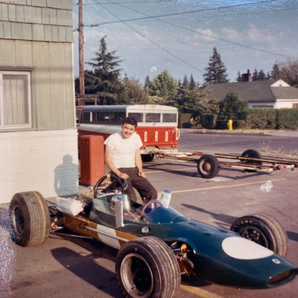 In about 1966 or 1967 he decided to become a race car owner and driver. To that end he spent about two years building a Formula Ford open-wheel race car from the ground up. He purchased the fiberglass body from a famous manufacturer in Australia and a Ford Cortina four-cylinder engine, a seat, gauges, a steering wheel, racing wheels, and tires. He manufactured the chassis, engine mounts, and front and rear suspension from alloy steel tubing.