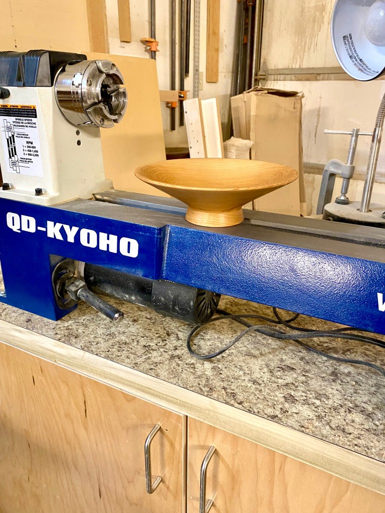 With that said, I finally put my bowl gouge to work. And in the last three days I turned my first two bowls after I wasted a throwaway piece while practicing the four basic cutting techniques. Number one is a 5” diameter poplar bowl (pictured above) and number two is a 8 ¼” diameter cherry bowl.